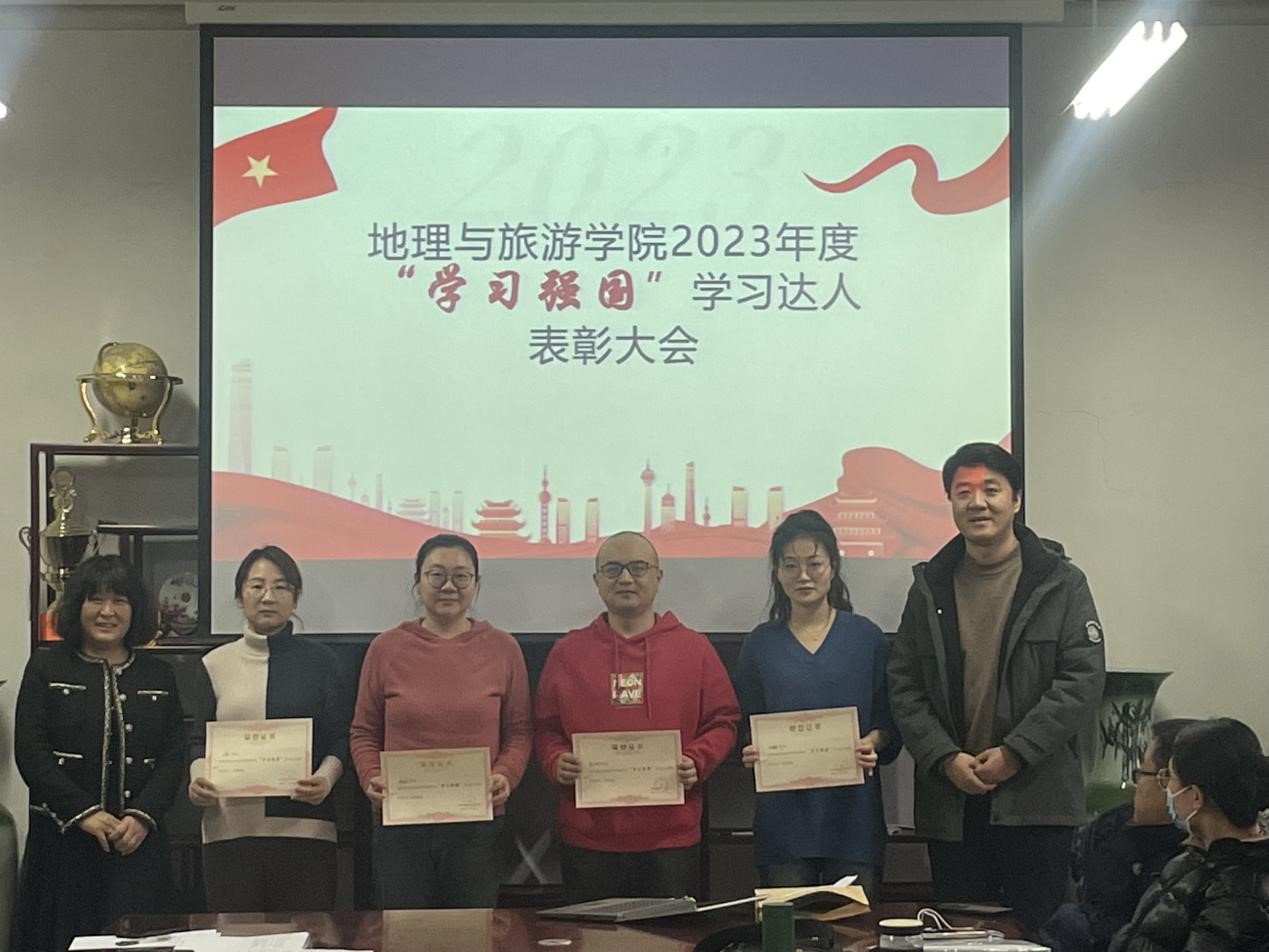 会上,学院党委书记秦拓宣读了2023年度地理与旅游学院“学习强国”学习达人获奖名单,并与副院长王敏一起为他们颁发了“学习达人”荣誉证书及学习纪念品。