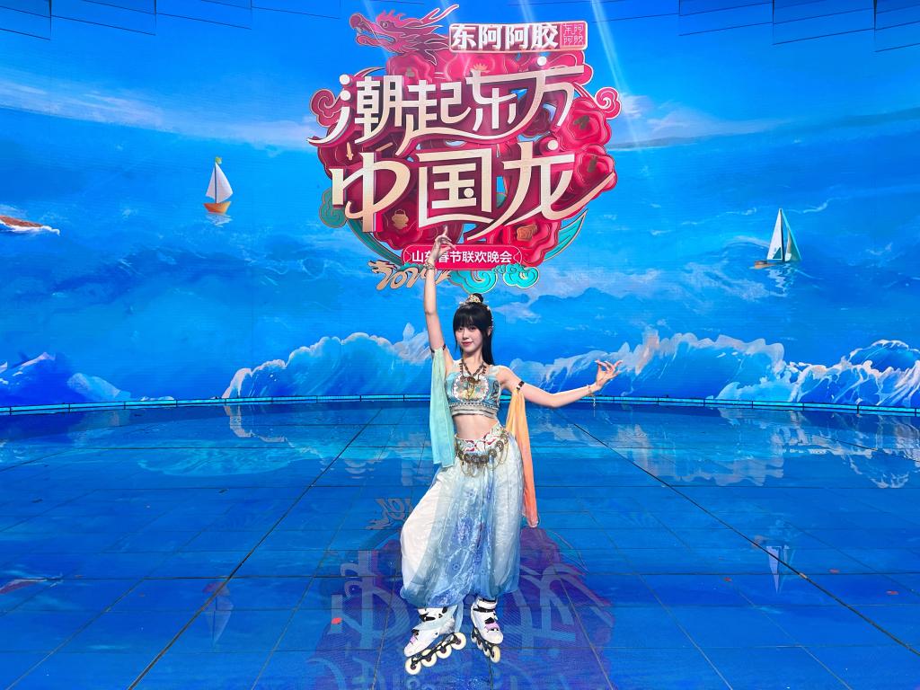 作为2022级体育学院的学生,秦雨晴始终坚持将传统古典的国风元素融入现代轮滑技艺中,形成了独特的轮滑风格,也通过这种创新形式展现着中华优秀传统文化的无穷魅力。在山东卫视春晚舞台上,她再次身着“敦煌飞天”彩衣“战袍”,以优美的身姿、绚丽的服饰和精湛的技巧,向全国观众奉上了一场“视觉盛宴”。演出中,她或飘逸如仙,或灵动活泼,伴随着轻盈的舞步和悠扬的音乐,演绎出敦煌艺术的精髓,引领着观众“梦回千年”,一起探寻辉煌的敦煌文化。此次春晚节目主持人周涛对秦雨晴的表演赞叹不已,给予了“翩若惊鸿、婉若游龙 ”的高度评价。