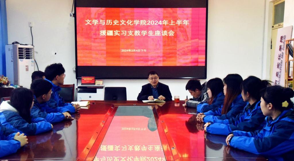 教育援疆是促进团结、凝聚人心的文化工程,援疆教师是做好教育援疆工作的关键核心力量。3月4日,在2024年上半年援疆实习支教学生即将出征之际,文学与历史文化学院召开援疆实习支教学生座谈会。学院院长张文哲,副院长孙红玉、朱振华,辅导员徐超、朱迪康以及12名援疆实习支教学生参加会议。