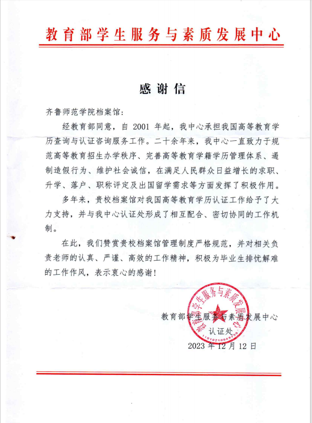 近期,齐鲁师范学院档案馆收到了教育部学生服务与素质发展中心认证处发来的感谢信。感谢学校档案馆用认真、严谨、高效的工作精神,长期协助教育部学生服务与素质发展中心认证处办理毕业生学籍档案查询和认证业务,对学校档案馆的工作表示充分肯定和高度赞扬。