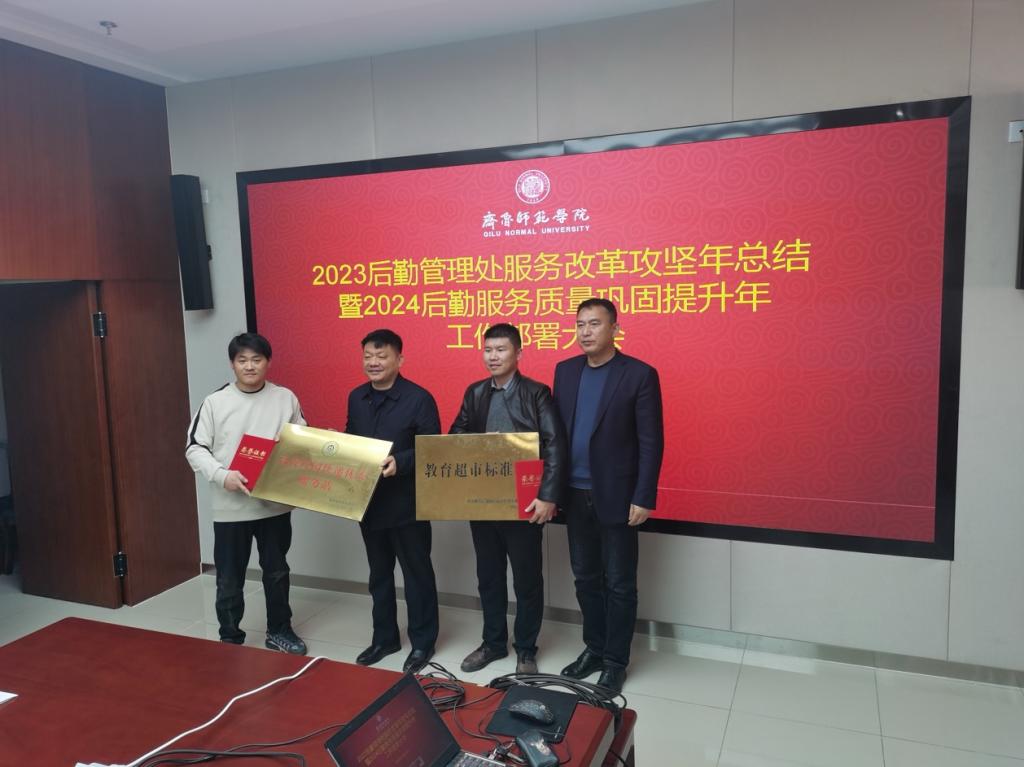 杨磊为2023年度获得山东省后勤协会表彰的服务单位颁发奖牌及荣誉证书。他对后勤管理处在2023年各方面工作中取得的成绩给予肯定,并表示,后勤管理处在2023年紧紧围绕高质量发展总目标,党政同心,上下齐心,各服务单位密切配合,后勤工作取得很大进步。对于2024年后勤服务工作,杨磊强调,要再接再厉,巩固当前良好局面;要加强制度建设,规范化管理;要加强对服务单位人员的关心关爱,培养服务人员的共同体意识;要健全“三全育人”体系,积极协同相关部门抓好学生的劳动意识培养,建立健全工作流程,不走表面形式。