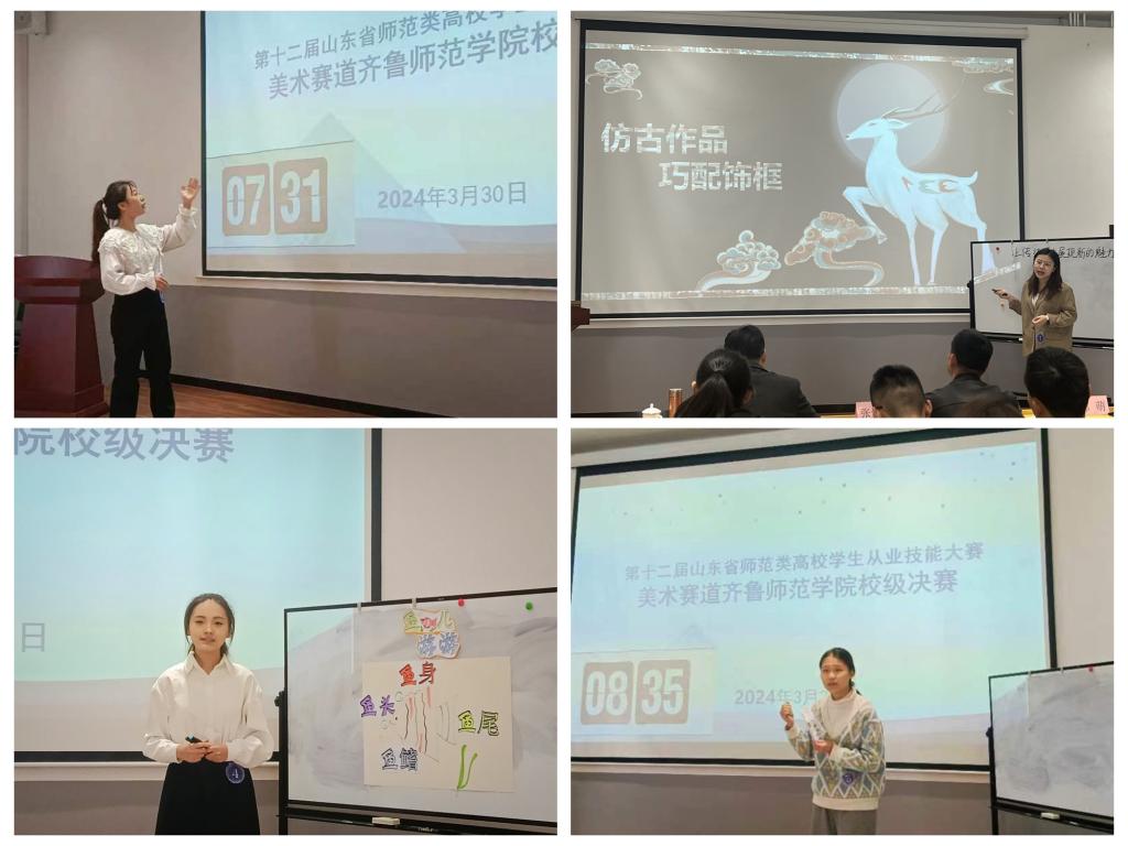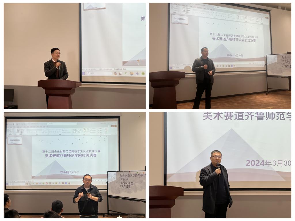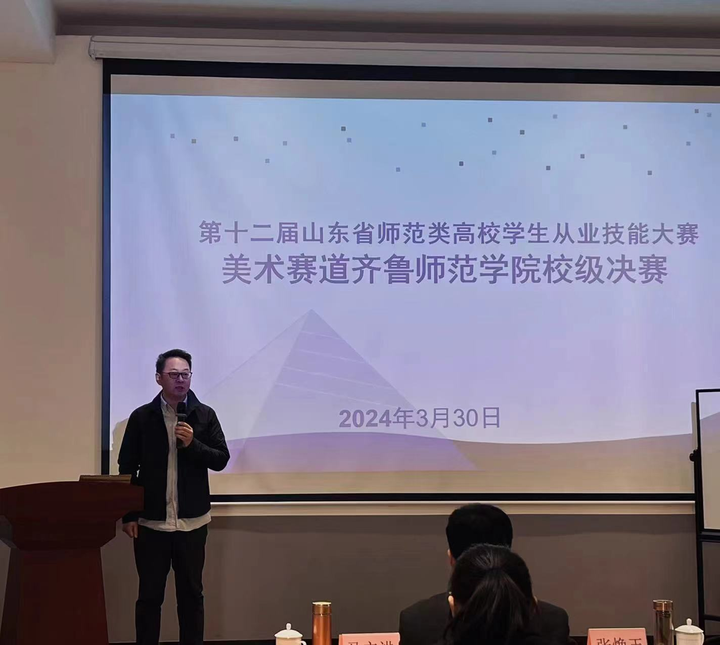 3月30日上午,第十二届山东省师范类高校学生从业技能大赛美术赛道齐鲁师范学院校级决赛在历下校区美术学院阶梯教室举办。济南市教育教学研究院美术教研员张焕玉,全国普通高等学校美术教育专业教师基本功大赛个人全能一等奖获得者、济南大学美术与设计学院美术系副主任马立洪,济南市市中区教体局艺术教研室负责人郭萌应邀作为专家评委莅临指导。美术学院党委书记辛源、院长杨三军、副院长李冉及部分学生代表观看比赛。